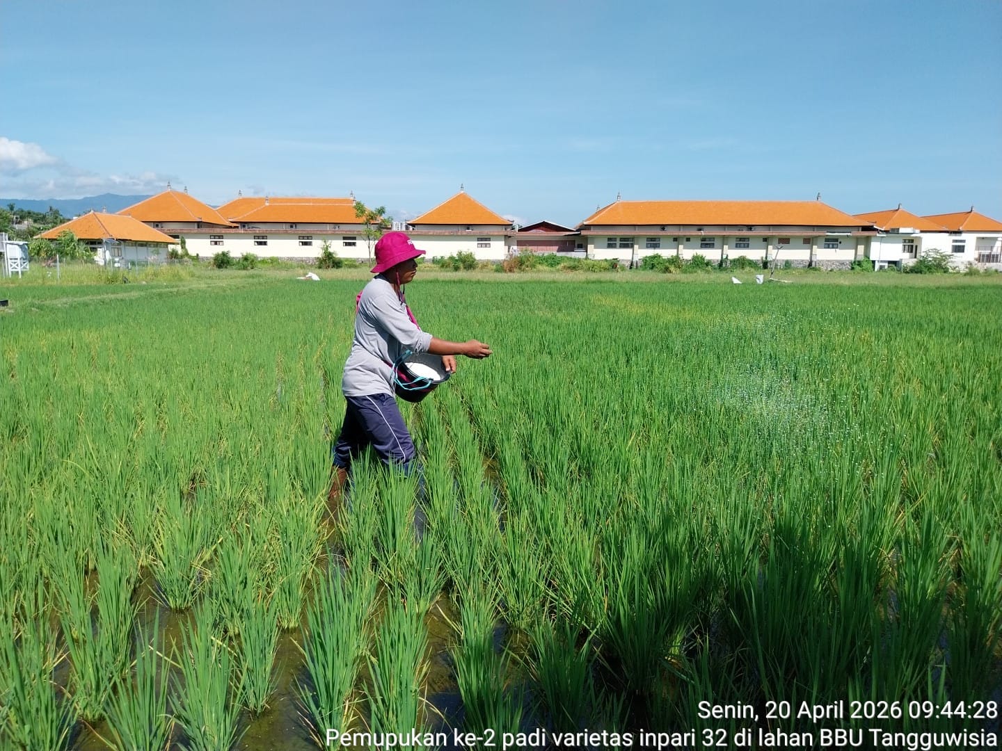 Senin, 20 April 2026, dilaksanakan kegiatan pemupukan ke-2 pada tanaman padi varietas Inpari 32 di lahan Balai Benih Utama (BBU) Tangguwisia, Kecamatan Seririt. Luas areal yang dilakukan pemupukan yaitu seluas 0,38 hektar dengan umur tanaman 39 Hari Setelah Tanam (HST).