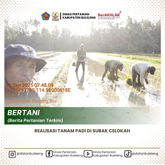 Telah terealisasi luas tambah tanam (LTT) 59,25% atau 11,85 ha dari 20 ha total luas lahan subak celokah desa subuk kecamatan busungbiu yang pada hari ini Rabu tanggal 24 September2025 memasuki hari keempat dalam pelaksanaan kegiatan tanam. Merupakan benih bantuan Pemerintah tahun 2025 Varitas Inpari-32.
