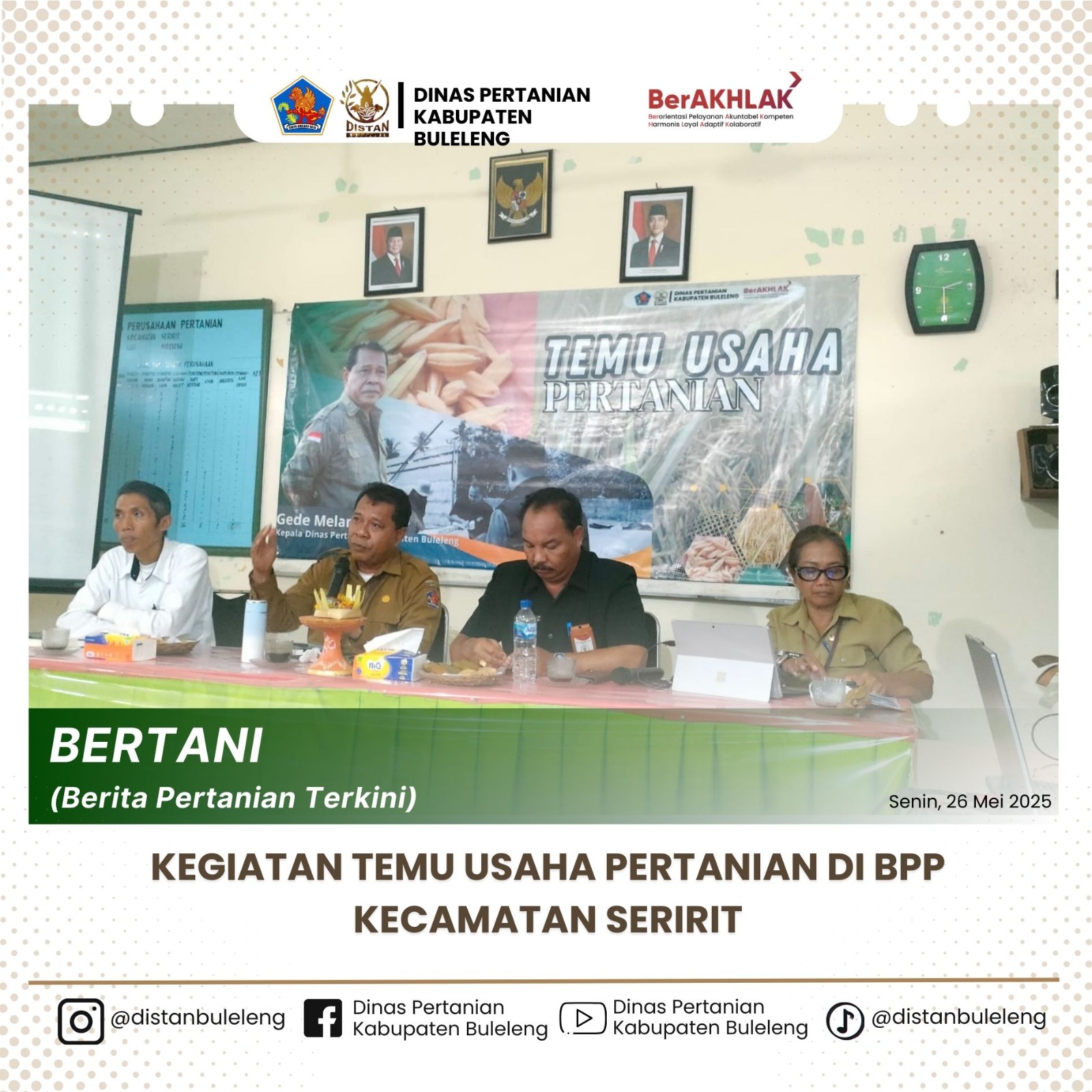 Dalam rangka memfasilitasi dan memberikan kesempatan kepada Subak atau Kelompok Tani untuk menjalin kerja sama dalam rangka memberikan kepastian harga dan upaya meningkatkan nilai tambah produk pertanian khususnya gabah dan jagung, maka pada hari Senin, 26 Mei 2025 Dinas Pertanian Kabupaten Buleleng, melalui Bidang Tanaman Pangan melaksanakan kegiatan Temu Usaha Pertanian bertempat di BPP Seririt, Kecamatan Seririt.