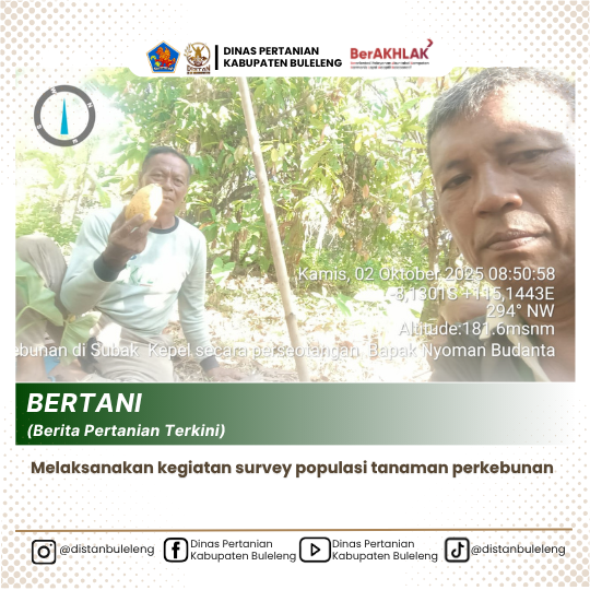 Pada hari kamis, 2 Oktober 2025 PPL Wilbin Desa Poh Bergong melaksanakan kegiatan survey populasi tanaman perkebunan sekaligus memberikan diseminasi informasi teknologi secara perseorangan kepada Bapak Nyoman Budanta,'Jenis-jenis Pemangkasan tanaman kakao".Bapak Nyoman Sudanta menjadi anggota subak Kepel dari komoditas perkebunan. Bapak Nyoman Budanta memiliki 25 pohon tanaman kakao dan 60 pohon tanaman cengkeh.