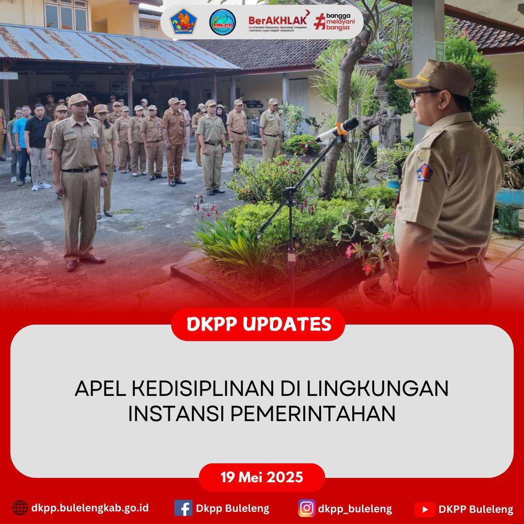 Senin, 19 Mei 2025 - Apel Pagi Dinas Ketahanan Pangan dan Perikanan (DKPP) Kabupaten Buleleng dalam rangka menjaga sikap kedisplinan di lingkungan Instansi Pemerintahan yang dipimpin Sekretaris Dinas Ariston Adhi Pamungkas, S.P., M. Env Man. yang mewakili Kepala Dinas dan diikuti seluruh jajaran.