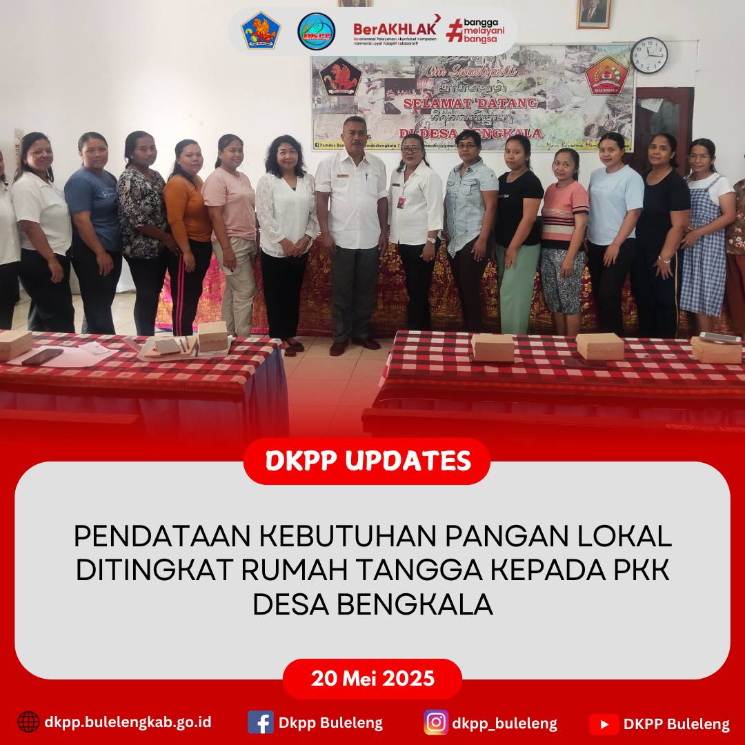 Rabu, 21 Mei 2025 - Dinas Ketahanan Pangan dan Perikanan (DKPP) Kabupaten Buleleng melalui Bidang Distribusi dan Cadangan Pangan melaksanakan Pendataan Kebutuhan Pangan Lokal ditingkat Rumah Tangga kepada PKK Desa Bengkala, Kecamatan Kubutambahan. Kegiatan dibuka oleh Sekdes Bengkala, serta dihadiri Analis Ketahanan Pangan (Nyoman Sukerni, S.H., M.Pd) bersama staf, dan Ketua Tim Penggerak PKK Desa Bengkala bersama para anggota.