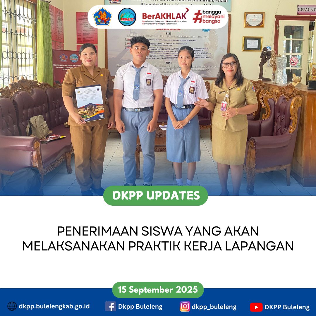 Senin, 15 September 2025 - Dinas Ketahanan Pangan dan Perikanan (DKPP) Kabupaten Buleleng menerima siswa dan siswi SMK Negeri 1 Singaraja yang akan melaksanakan PKL (Praktik Kerja Lapangan) selama 6 bulan kedepan. Siswa tersebut merupakan siswa kelas XII dari Jurusan MPLB (Manajemen Perkantoran dan Layanan Bisnis).