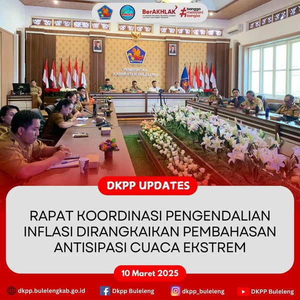 Senin, 10 Maret 2025 - Bertempat di Ruang Rapat Kantor Bupati Buleleng, Kepala Dinas Ketahanan Pangan dan Perikanan (DKPP) Kabupaten Buleleng I Gede Putra Aryana, S.Sos., MAP bersama jajaran Tim Pengendalian Inflasi Daerah (TPID) mengikuti Zoom Meeting Rapat Koordinasi Pengendalian Inflasi yang dirangkaikan dengan Pembahasan Antisipasi Cuaca Ekstrem pada periode hari raya Idul Fitri 1446 H Tahun 2025. Rapat dipimpin oleh Menteri Dalam Negeri Republik Indonesia dengan melibatkan unsur kementerian/lembaga serta jajaran instansi pemerintah daerah.