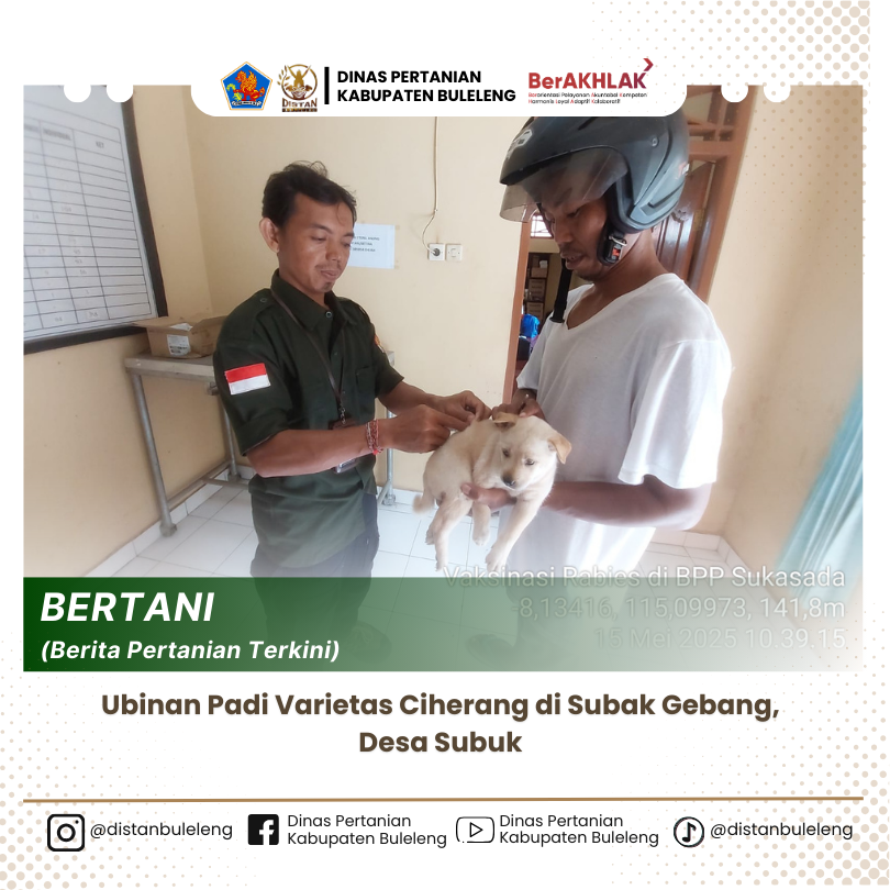 Kamis, 15 Mei 2025 telah dilakukan pelayanan kesehatan hewan berupa vaksinasi rabies pada anjing peliharaan milik warga di Puskeswan BPP Kecamatan Sukasada. Pemilik hewan peliharaan secara mandiri membawa 1 ekor anjing peliharaannya untuk mendapatkan vaksinasi agar peliharaannya terhindar dari virus rabies. Adapun umur dari anjing yang divaksinasi yaitu 3 bulan.