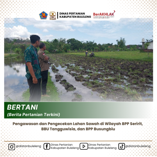 Pada hari Selasa 16 September 2025, Plt. Kepala Bidang Penyuluhan dan Staf melaksanakan pengawasan dan pengecekan lahan pertanian. Pengawasan dan pengecekan lahan pertanian merupakan salah satu kegiatan penting dalam mendukung keberhasilan budidaya tanaman pangan, khususnya padi. Baru-baru ini, telah dilaksanakan kegiatan pengawasan dan pengecekan lahan sawah di tiga wilayah berbeda, yakni BPP Seririt, BBU Tangguwisia, dan BPP Busungbiu. Kegiatan ini bertujuan untuk memastikan bahwa proses pengolahan dan pertanaman berjalan sesuai standar serta memantau perkembangan tanaman di lapangan.