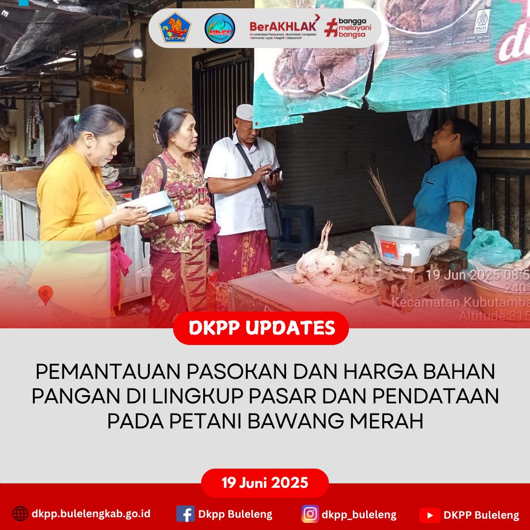 Kamis 19 Juni 2025 - Dinas Ketahanan Pangan dan Perikanan (DKPP) Kabupaten Buleleng melalui Bidang Distribusi dan Cadangan Pangan melaksanakan Pemantauan Pasokan dan Harga Bahan Pangan di Pasar Tamblang dan Pendataan pada Petani Bawang Merah di Desa Bungkulan.