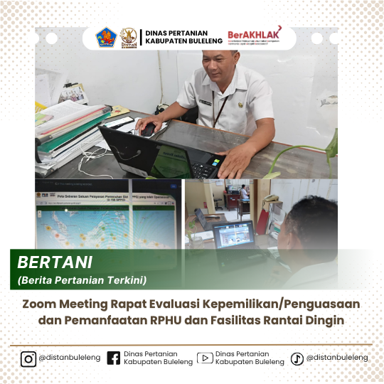 Medik veteriner dari Bidang Peternakan dan Kesehatan Hewan, Dinas Pertanian Kabupaten Buleleng, pada hari ini mengikuti Rapat Evaluasi Kepemilikan/Penguasaan dan Pemanfaatan Rumah Potong Hewan Unggas (RPHU) dan Fasilitas Rantai Dingin secara daring melalui Zoom Meeting. Rapat ini diselenggarakan oleh Direktorat Jenderal Peternakan dan Kesehatan Hewan, Kementerian Pertanian RI.