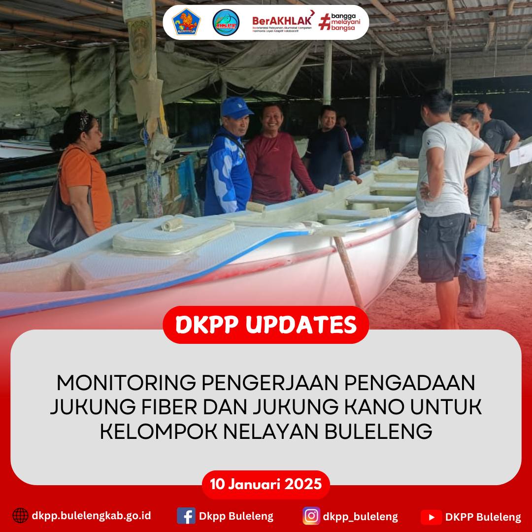 Pengadaan kedua Jukung tersebut bersumber dari Bantuan Hibah Uang APBD Kabupaten Buleleng Tahun 2024. Sampai saat ini, progres pengerjaan pengadaan Jukung Fiber sebanyak 3 unit dan Jukung Kano sebanyak 2 unit telah mencapai 50%. Kegiatan monitoring ini dihadiri Kabid Produksi Perikanan (Maria Cornelia Lero Bhara, S.Pi.) bersama Fungsional Pengelola Produksi Perikanan Tangkap dan staf terkait.