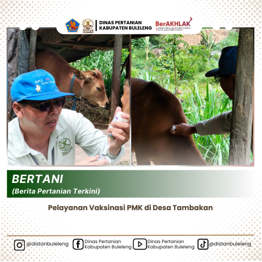Hari ini Kamis 25 September 2025 Tim dari Dinas Pertanian Kabupaten Buleleng melaksanakan pelayanan vaksinasi Penyakit Mulut dan Kuku (PMK) di Desa Tambakan, Kecamatan Kubutambahan. Kegiatan ini melibatkan dokter hewan Kecamatan Kubutambahan bersama mahasiswa Universitas Udayana yang sedang melaksanakan Praktik Kerja Lapangan (PKL) di Bidang Peternakan dan Kesehatan Hewan Dinas Pertanian Kabupaten Buleleng.