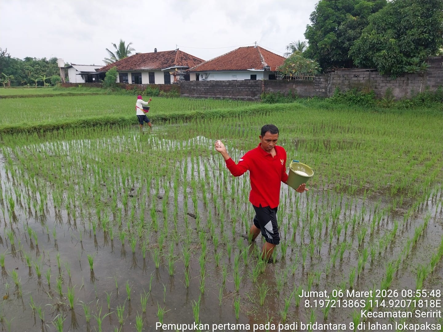 Bidang Sarana dan Prasarana Penyuluhan pada hari Jumat, 6 Maret 2026 melaksanakan kegiatan pemupukan pertama pada tanaman padi Bridantara 8 di lahan Lokapaksa dengan luas lahan ±0,5 hektar. Kegiatan ini bertujuan untuk mendukung pertumbuhan awal tanaman agar dapat berkembang dengan baik dan optimal.
