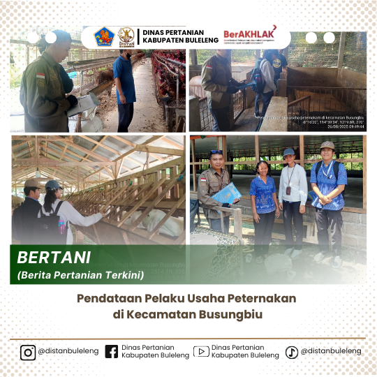 Busungbiu, 26 Agustus 2025 dilakukan kegiatan pendataan pelaku usaha peternakan di Kecamatan Busungbiu yang dilaksanakan oleh dokter hewan kecamatan Busungbiu bersama Penata Layanan Operasional Kabupaten Buleleng. Kegiatan ini bertujuan untuk memetakan jumlah, kapasitas, serta jenis usaha peternakan yang ada di wilayah Busungbiu, sekaligus memastikan keberlanjutan dan pengelolaan peternakan berjalan sesuai standar.