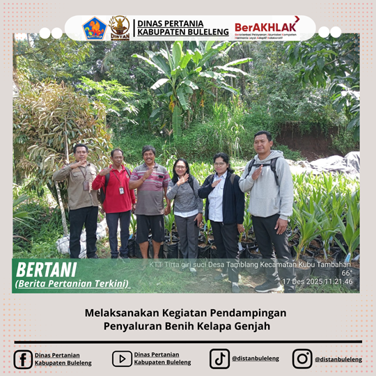 Selasa tanggal 17 Desember 2025, Staf bidang perkebunan (2 orang pengadministrasi perkantoran) melaksanakan Kegiatan Pendampingan Penyaluran Benih Kelapa Genjah, merupakan bagian dari pelaksanaan Program Perluasan Kelapa Genjah yang bersumber dari anggaran APBN Tahun 2025. Kegiatan ini bertujuan untuk mendukung pengembangan komoditas kelapa genjah serta meningkatkan produktivitas dan pendapatan petani melalui perluasan areal tanam kelapa genjah di Kabupaten Buleleng.