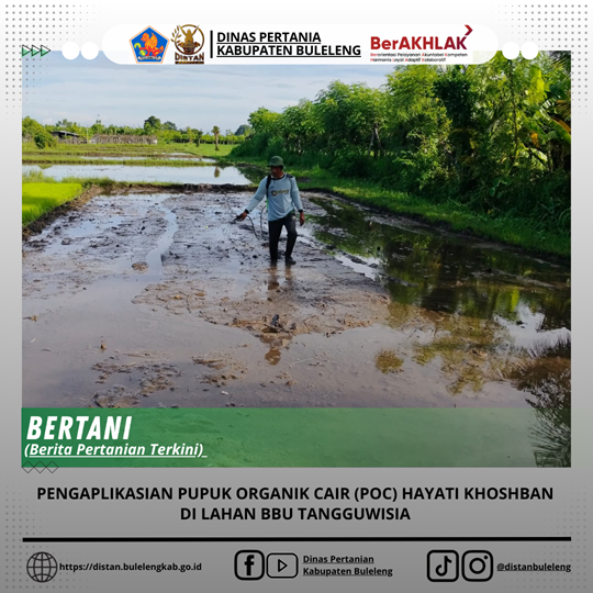 Senin, 2 Februari 2026, Dalam rangka mendukung pemanfaatan lahan pertanian, telah dilaksanakan kegiatan pengaplikasian Pupuk Organik Cair (POC) hayati KHOSBAN di lahan BBU Tangguwisia. POC hayati ini merupakan pupuk organik cair berbasis mikroorganisme dan senyawa biologis aktif yang berfungsi untuk meningkatkan kesuburan tanah serta mendukung pertumbuhan tanaman secara optimal. POC hayati seperti KHOSBAN diaplikasikan dengan cara :