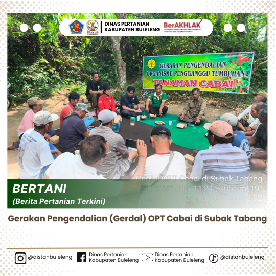 Hari ini, 21 Agustus 2025 telah dilaksanakan Gerdal OPT pada Tanaman Cabai di Subak Tabang Kecamatan Sawan dihadiri oleh POPT Bidang Hortikultura beserta staf, Koordinator BPP Kecamatan Sawan, POPT Sawan dan PPL Wilbin Desa Bebetin berdasarkan hasil pengamatan OPT dan laporan peringatan bahaya yang sudah dikirim ke bidang hortikultura.