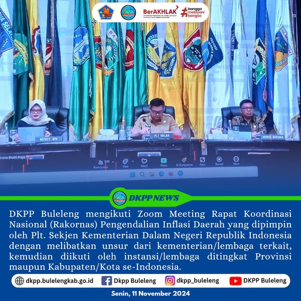Bertempat di Ruang Rapat Kantor Bupati Buleleng pada hari Senin, 11 November 2024, Dinas Ketahanan Pangan dan Perikanan (DKPP) Kabupaten Buleleng mengikuti Zoom Meeting Rapat Koordinasi Nasional (Rakornas) Pengendalian Inflasi Daerah yang dipimpin oleh Plt. Sekjen Kementerian Dalam Negeri Republik Indonesia dengan melibatkan unsur dari kementerian/lembaga terkait, kemudian diikuti oleh instansi/lembaga ditingkat Provinsi maupun Kabupaten/Kota se-Indonesia yang tergabung dalam Tim Satgas Ketahanan Pangan & TPID (Tim Pengendalian Inflasi Daerah), serta dari Pemkab Buleleng diikuti oleh perwakilan instansi terkait, dan Kabid Ketersediaan dan Kerawanan Pangan DKPP Buleleng (drh. I Wayan Susila).