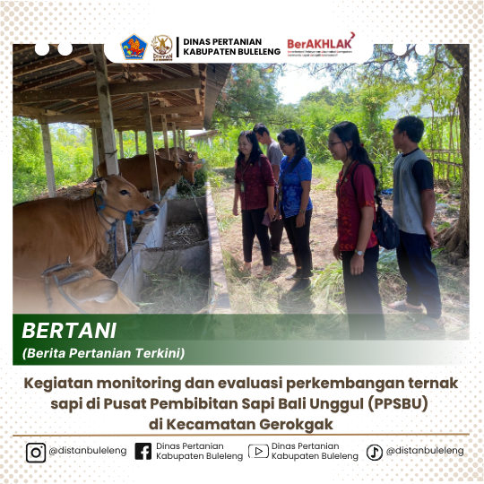 Pada hari ini, Selasa (15/7/2025), Telah dilaksanakan kegiatan monitoring dan evaluasi perkembangan ternak sapi di Pusat Pembibitan Sapi Bali Unggul (PPSBU) di Kecamatan Gerokgak. Kegiatan ini merupakan bagian dari upaya berkelanjutan untuk meningkatkan kualitas dan produktivitas ternak sapi di PPSBU Kecamatan Gerokgak, Kabupaten Buleleng.Monitoring dan evaluasi dilaksanakan oleh petugas Pengawas Kesmavet dan Uspet, Pengawas Bibit Ternak, Bidang Peternakan dan Kesehatan Hewan Dinas Pertanian Kabupaten Buleleng.