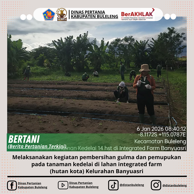 Selasa 6 Januari 2026 melaksanakan kegiatan pembersihan gulma dan pemupukan pada tanaman kedelai di lahan integrated farm (hutan kota) Kelurahan Banyuasri. Pembersihan gulma pada tanaman kedelai secara manual (penyiangan) dilakukan dengan mencabut gulma di sekitar tanaman menggunakan tangan atau alat seperti cangkul kecil/weeder untuk menghindari kompetisi unsur hara, cahaya, dan ruang, serta sangat efektif untuk gulma rumput dan daun lebar. Pada hari ini juga dilakukan pemupukan kedelai, yang penting untuk pertumbuhan optimal. Biasanya dilakukan bertahap : pupuk dasar (kandang/NPK saat tanam), lalu pupuk susulan pada 10-25 HST (Urea, TSP, KCl), dan pupuk susulan kedua pada 30-45 HST (KCl, Urea, NPK) untuk mendukung fase vegetatif dan generatif, dengan dosis bervariasi tergantung kesuburan tanah. Pemupukan hari ini pada umur 14 HST dengan pemberian pupuk NPK Mutiara dengan dosis spesifik yang direkomendasikan bervariasi selain tergantung kondisi tanah juga varietas kedelai. Namun pedoman umum berkisar antara 3 gram per tanaman.