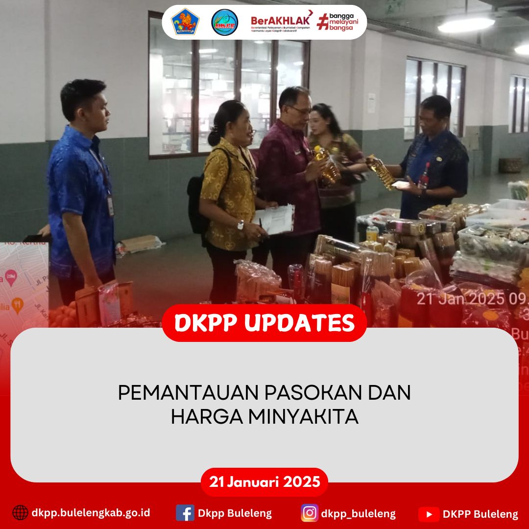Selasa, 21 Januari 2025, Dinas Ketahanan Pangan dan Perikanan (DKPP) Kabupaten Buleleng melalui Bidang Distribusi dan Cadangan Pangan melakukan pemantauan pasokan dan harga bahan pangan pokok di Pasar Banyuasri, khususnya minyak goreng (Minyakita) yang sedang mengalami trend kenaikan harga. Pada kegiatan ini hadir Analis Pasar Hasil Pertanian (Ni Luh Putu Swartini, S.P), serta turut hadir Kadis DisdagperinkopUKM Buleleng dan jajaran lainnya.
