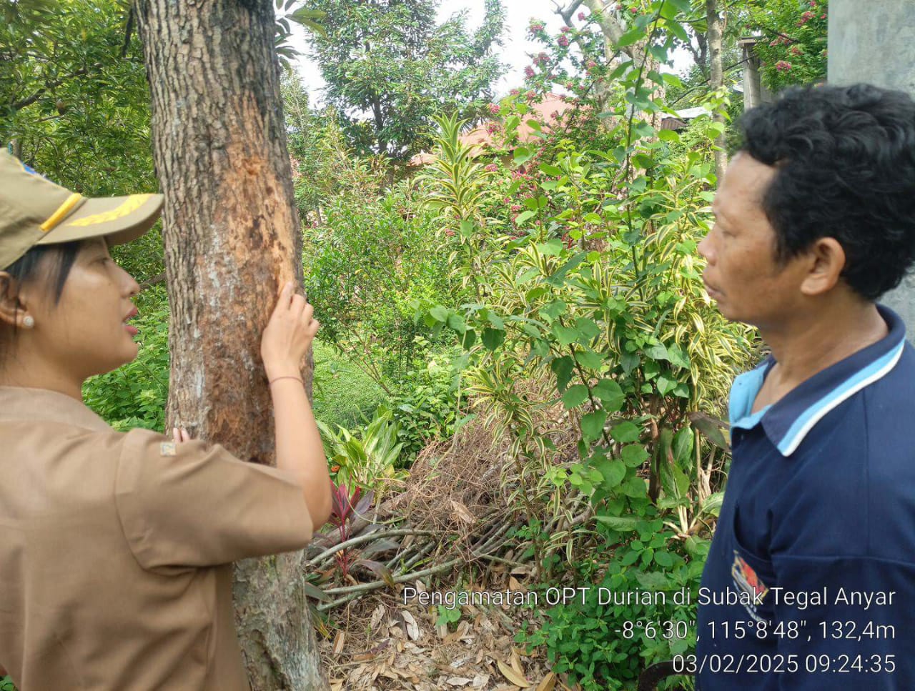 Hari ini, Senin 3 Pebruari 2025 POPT Kecamatan Sawan didampingi oleh PPL Wilbin Desa Sangsit melakukan pengamatan OPT Tanaman Durian pada varietas kane di Subak Tegal Anyar Desa Sangsit Kecamatan Sawan, Kabupaten Buleleng. Adapun OPT yang ditemukan pada saat melakukan pengamatan adalah penyakit kanker batang dengan gejala serangan intensitas ringan. Gejala serangan yang tampak pada batang antara lain timbulnya bekas luka warna coklat kemerahan apabila kulit batang dikelupas akan terlihat garis-garis coklat kehitaman. Penyakit kanker batang pada tanaman durian menyebar dengan cepat saat musim penghujan karena kelembapan mendukung perkembangan penyakit.