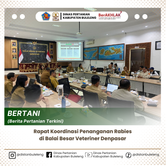 Pada tanggal 28 Juli 2025, Sekretaris Dinas Pertanian Kabupaten Buleleng dan Fungsional Medik Veteriner menghadiri rapat koordinasi penanganan rabies di Balai Besar Veteriner Denpasar. Rapat ini dipimpin langsung oleh Kepala BBVet Denpasar bersama Kepala Pelaksana BPBD Provinsi Bali, Kabid Kesehatan Dinas Kesehatan Provinsi Bali, dan Kabid PKH Dinas Pertanian dan Ketahanan Pangan Provinsi Bali. Turut hadir Kapolda Bali, Komandan Korem 163/Wirasatya, Tikorda (Tim Koordinasi Daerah) Pencegahan dan Pengendalian Zoonosis dan Penyakit Infeksius Baru Provinsi Bali se-Bali, BPBD kabupaten/kota se-Bali, Dinas yang membidangi fungsi peternakan dan kesehatan hewan kabupaten/kota se-Bali, dan beberapa dari Dinas Kesehatan kabupaten/kota se-Bali. Tujuan rakor ini adalah pembahasan penanganan rabies menuju Bali bebas rabies tahun 2028 dengan kunci utama pengendalian rabies yaitu vaksinasi, sterilisasi dan eliminasi tertarget. Ketiga hal tersebut belum dapat terlaksana dengan baik apabila data populasi belum valid atau masih estimasi sehingga perlu adanya pendataan populasi HPR ulang yang tepat.