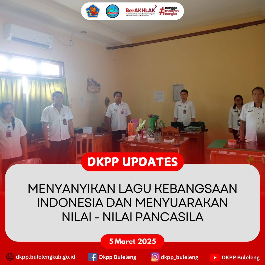 Rabu, 5 Maret 2025 - Jajaran Dinas Ketahanan Pangan dan Perikanan (DKPP) Kabupaten Buleleng Memperdengarkan / Menyanyikan Lagu Kebangsaan Indonesia Raya dan Menyuarakan Nilai - Nilai Pancasila, dalam rangka implementasi berdasarkan Surat Edaran Gubernur Provinsi Bali Nomor 6 Tahun 2025.