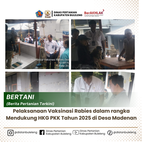 Hari ini Rabu, 14 Mei 2025 Dalam rangka puncak acara peringatan Hari Kesatuan PKK, Dinas Pertanian Kabupaten Buleleng melalui Pusat kesehatan hewan Kecamatan Tejakula bersama dengan Dinas Pertanian Ketahanan Pangan Provinsi Bali menggelar kegiatan vaksinasi rabies massal untuk hewan peliharaan, khususnya anjing dan kucing yang dilaksanakan di Desa Madenan, Kecamatan Tejakula