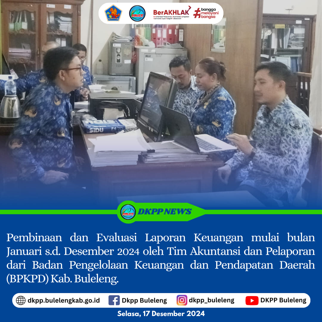 Sub Bagian Keuangan - Dinas Ketahanan Pangan dan Perikanan (DKPP) Kabupaten Buleleng menerima Tim Akuntansi dan Pelaporan dari Badan Pengelolaan Keuangan dan Pendapatan Daerah (BPKPD) Kab. Buleleng pada hari Selasa, 17 Desember 2024, dalam rangka Pembinaan dan Evaluasi Laporan Keuangan mulai bulan Januari s.d. Desember 2024. Adapun hasil kegiatan ini yaitu tidak ditemukannya angka selisih yang mempengaruhi laporan keuangan pada DKPP Buleleng.