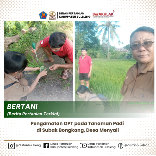 Pengamatan Organisme Pengganggu Tumbuhan (OPT) kembali dilakukan pada tanaman padi di Subak Bongkang, Desa Menyali, Kecamatan Sawan, Kabupaten Buleleng. Kegiatan ini dilaksanakan pada Senin, 21 Juli 2025 oleh Petugas Pengendali Organisme Pengganggu Tumbuhan (POPT), Penyuluh Pertanian Wilbin Menyali dan Jagaraga, serta petani anggota Subak Bongkang. Pengamatan ini bertujuan untuk mendeteksi dan mengidentifikasi secara dini kemungkinan serangan OPT, sehingga langkah pencegahan dan pengendalian dapat segera ditentukan.
