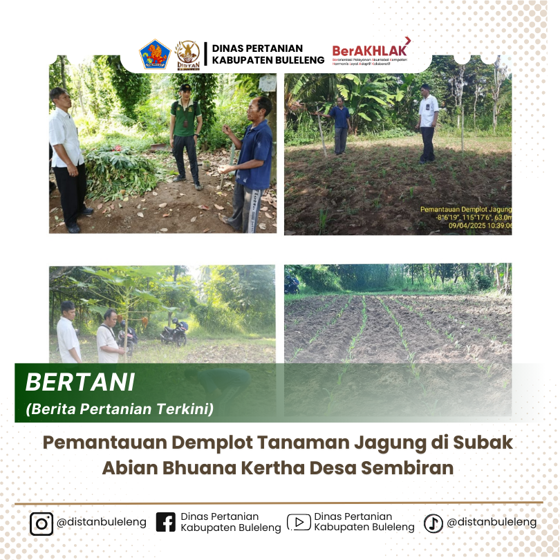 Pada hari Rabu, 9 April 2025 dilaksanakan kegiatan pemantauan tanaman jagung di Subak Abian Bhuana Kertha Desa Sembiran, pada kegiatan tersebut dihadiri oleh Koordinator P2K Tejakula, PPL Desa Sembiran, Penuktukan dan Tejakula serta petugas data dan anggota SA Bhuana Kertha desa Sembiran. Kegiatan pemantuaan pada hari ini dilaksanakan di lokasi demplot Lahan Bapak Nyoman Sudiarsa seluas 5 are.