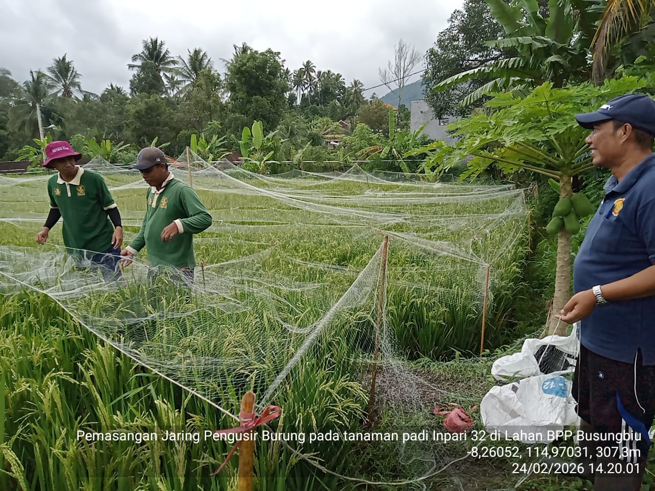 Bidang Sarana Prasarana dan Penyuluhan Dinas Pertanian, Ketahanan Pangan dan Perikanan pada hari Selasa, 24 Februari 2026 melaksanakan pemasangan jaring pengusir burung pada padi varietas Inpari 32 umur tanaman 88 HST seluas 0,40 ha di lahan BPP Busungbiu.