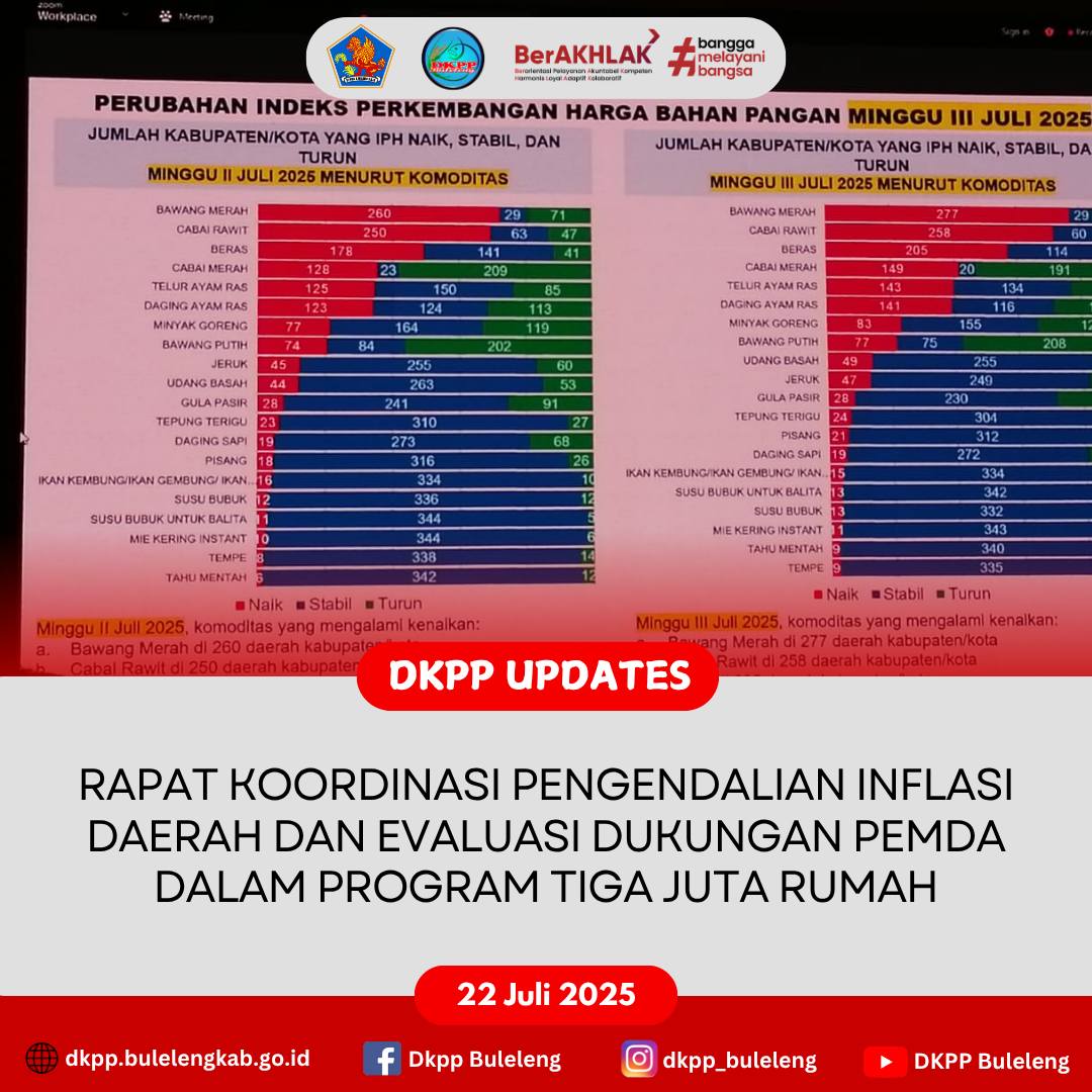 Selasa, 22 Juli 2025 - Bertempat di Ruang Rapat Kantor Bupati Buleleng, Dinas Ketahanan Pangan dan Perikanan (DKPP) Kabupaten Buleleng mengikuti Zoom Meeting Rapat Koordinasi Pengendalian Inflasi Daerah dan Evaluasi Dukungan Pemerintah Daerah Dalam Program 3 Juta Rumah. Zoom Meeting ini melibatkan unsur kementerian/lembaga, serta instansi terkait ditingkat Provinsi maupun Kabupaten/Kota se-Indonesia.