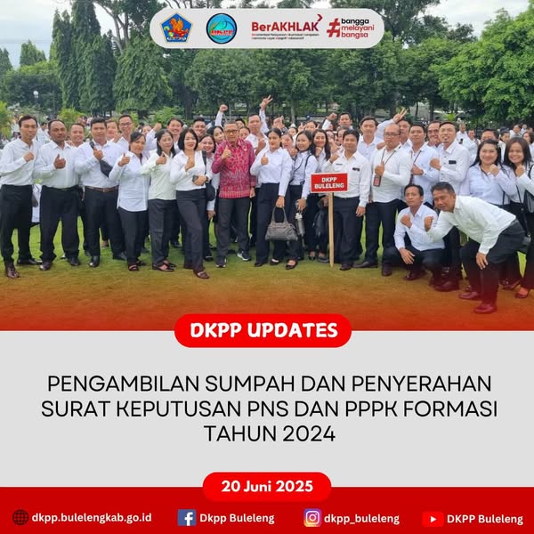 Jumat, 20 Juni 2025 - Tenaga Kontrak (Non-ASN) Dinas Ketahanan Pangan dan Perikanan (DKPP) Kabupaten Buleleng mengikuti Pengambilan Sumpah/Janji dan Penyerahan Surat Keputusan PNS & PPPK Formasi Tahun 2024 bertempat di Taman I Gusti Ngurah Rai (Taman Kota Singaraja). Kegiatan diikuti jajaran CPNS & Calon PPPK Pemkab Buleleng, serta hadir Bupati Buleleng dr. I Nyoman Sutjidra, Sp.OG, dan Wakil Bupati Buleleng Gede Supriatna SH., Ketua DPRD Buleleng, Sekda Buleleng, Forkopimda, serta hadirin undangan dari berbagai unsur.