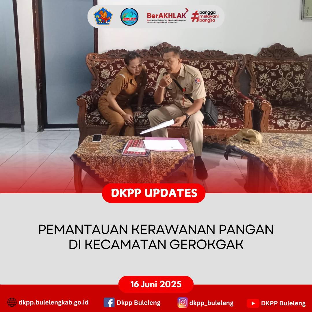 Senin, 16 Juni 2025 - Dinas Ketahanan Pangan dan Perikanan (DKPP) Kabupaten Buleleng melalui Bidang Ketersediaan dan Kerawanan Pangan melakukan Pemantauan Kerawanan Pangan berlokasi di Desa Musi dan Desa Pemuteran, Kecamatan Gerokgak dengan menyasar informasi data pendukung pelaporan penyusunan data Sistem Peringatan Dini Kerawanan Pangan dan Gizi (SKPG) dan Peta Ketahanan dan Kerentanan Pangan / Food Security and Vulnerability Atlas (FSVA) yang meliputi data - data aspek ketersediaan, pemanfaatan serta akses pangan. Kegiatan dihadiri Analis Ketahanan Pangan (I Gusti Bagus Ngurah Agung Surya Wibawa, S. PT.).