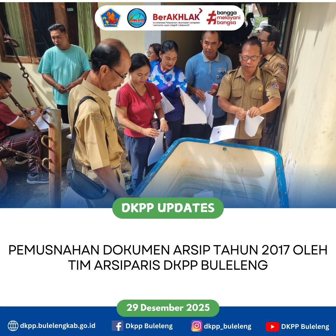 Tim Arsiparis Dinas Ketahanan Pangan dan Perikanan (DKPP) Kabupaten Buleleng melaksanakan Pemusnahan Dokumen Arsip kurun waktu Tahun 2017, bertempat di ruang record center DKPP Buleleng yang disaksikan langsung oleh Tim Pendampingan Pemusnahan Arsip dari Dinas Arsip dan Perpustakaan Daerah Kab. Buleleng. Senin (29/12)