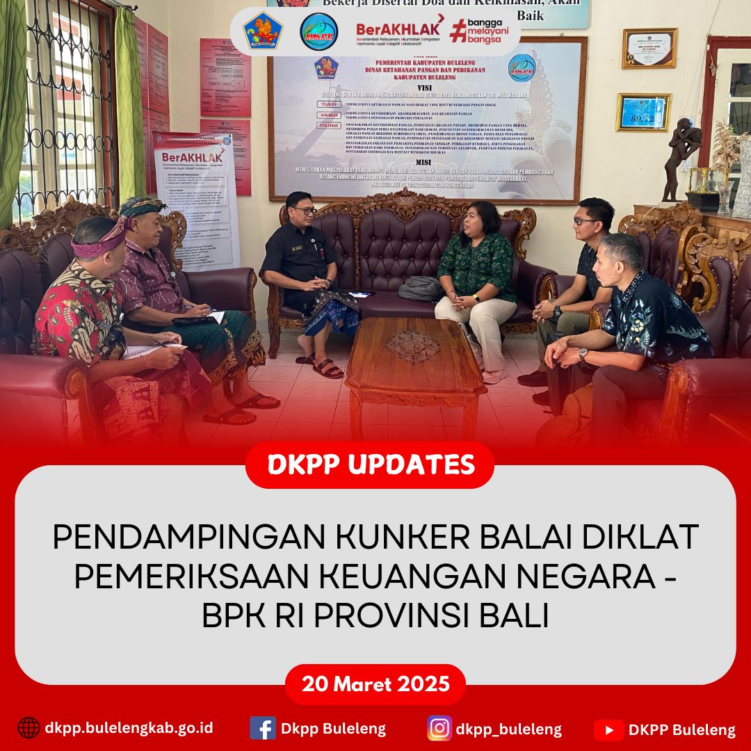 Kamis, 20 Maret 2025 - Dinas Ketahanan Pangan dan Perikanan (DKPP) Kabupaten Buleleng melaksanakan pendampingan kunjungan kerja Balai Pendidikan dan Pelatihan Pemeriksaan Keuangan Negara (Diklat PKN) - BPK RI Perwakilan Provinsi Bali. Tim Balai Diklat PKN - BPK RI Perwakilan Bali diterima langsung oleh Sekretaris DKPP Buleleng Ariston Adhi Pamungkas, S.P., M. Env Man. bersama Analis Akuakultur dan Analis Pengelola Produksi Perikanan Tangkap.