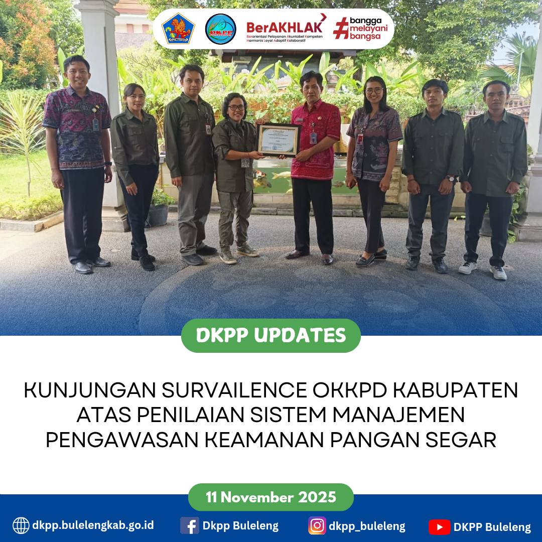 Pangan dan Perikanan (DKPP) Kabupaten Buleleng melalui Bidang Penganekaragaman Konsumsi dan Keamanan Pangan selaku OKKPD Kabupaten menerima kunjungan dari tim OKKPD Provinsi Dinas Pertanian dan Ketahanan Pangan Provinsi Bali. Kunjungan dilaksanakan dalam rangka survailence kepada OKKPD Kabupaten setelah dilaksanakan penilaian sistem manajemen pengawasan keamanan pangan segar di daerah.