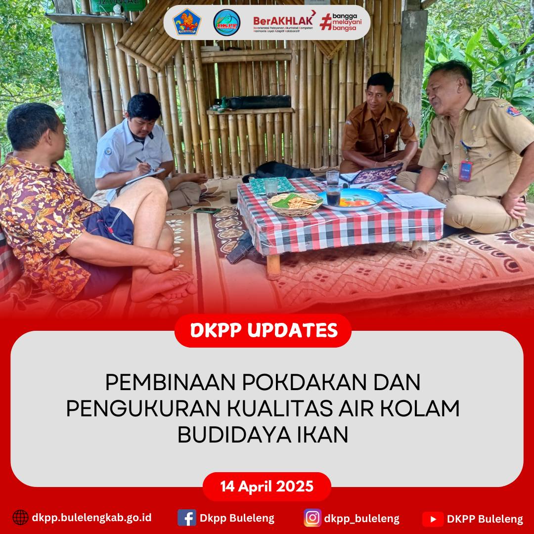 Senin, 14 April 2025 - Dinas Ketahanan Pangan dan Perikanan (DKPP) Kabupaten Buleleng melalui Bidang Produksi Perikanan melaksanakan Pembinaan Kelompok Pembudidaya Ikan (Pokdakan) dan Pengukuran Kualitas Air Kolam Budidaya Ikan pada Pokdakan Tirta Baru di Desa Ambengan dan Pokdakan Mina Toya Ning di Desa Pegadungan, Kecamatan Sukasada. Kegiatan dihadiri Analis Akuakultur (Nyoman Agus Sudarta, S.Pi) beserta staf.