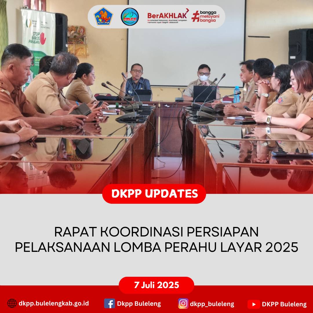 Senin, 7 Juli 2025 - Bertempat di Ruang Rapat Dinas Ketahanan Pangan dan Perikanan (DKPP) Kabupaten Buleleng diselenggarakan Rapat Koordinasi Persiapan Pelaksanaan Lomba Perahu Layar dalam rangka mendukung Festival Lovina Tahun 2025. Rapat dipimpin Kadis DKPP Buleleng I Gede Putra Aryana, S.Sos., MAP. didampingi Sekdis dan dihadiri jajaran pejabat dan staf.