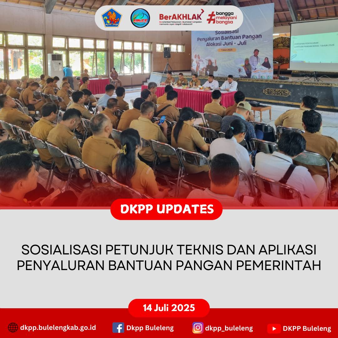 Senin, 14 Juli 2025 - Bertempat di Gedung Laksmi Graha, Dinas Ketahanan Pangan dan Perikanan (DKPP) Kabupaten Buleleng bersinergi bersama Perum. BULOG Kantor Wilayah Provinsi Bali menyelenggarakan Sosialisasi Petunjuk Teknis dan Aplikasi Penyaluran Bantuan Pangan Pemerintah Alokasi Juni - Juli 2025. Pada kegiatan ini hadir Kadis DKPP Buleleng I Gede Putra Aryana, S.Sos., MAP. bersama jajaran terkait, Dinsos Buleleng, serta para Kepala Desa/Lurah se-Kabupaten Buleleng.