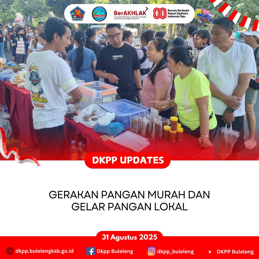Minggu, 31 Agustus 2025, Gerakan Pangan Murah dan Gelar Pangan Lokal (GPM & GPL) berlokasi di Car Free Day - Jalan Ngurah Rai (depan Taman Kota Singaraja) yang menyediakan berbagai kebutuhan bahan pokok, olahan pangan lokal, hingga buah lokal yang dijajakan oleh pelaku UMKM Buleleng. Pada kesempatan ini hadir Wakil Bupati Buleleng Gede Supriatna SH. bersama jajaran Forkopimda, Pimpinan Instansi Perangkat Daerah, serta masyarakat Buleleng.