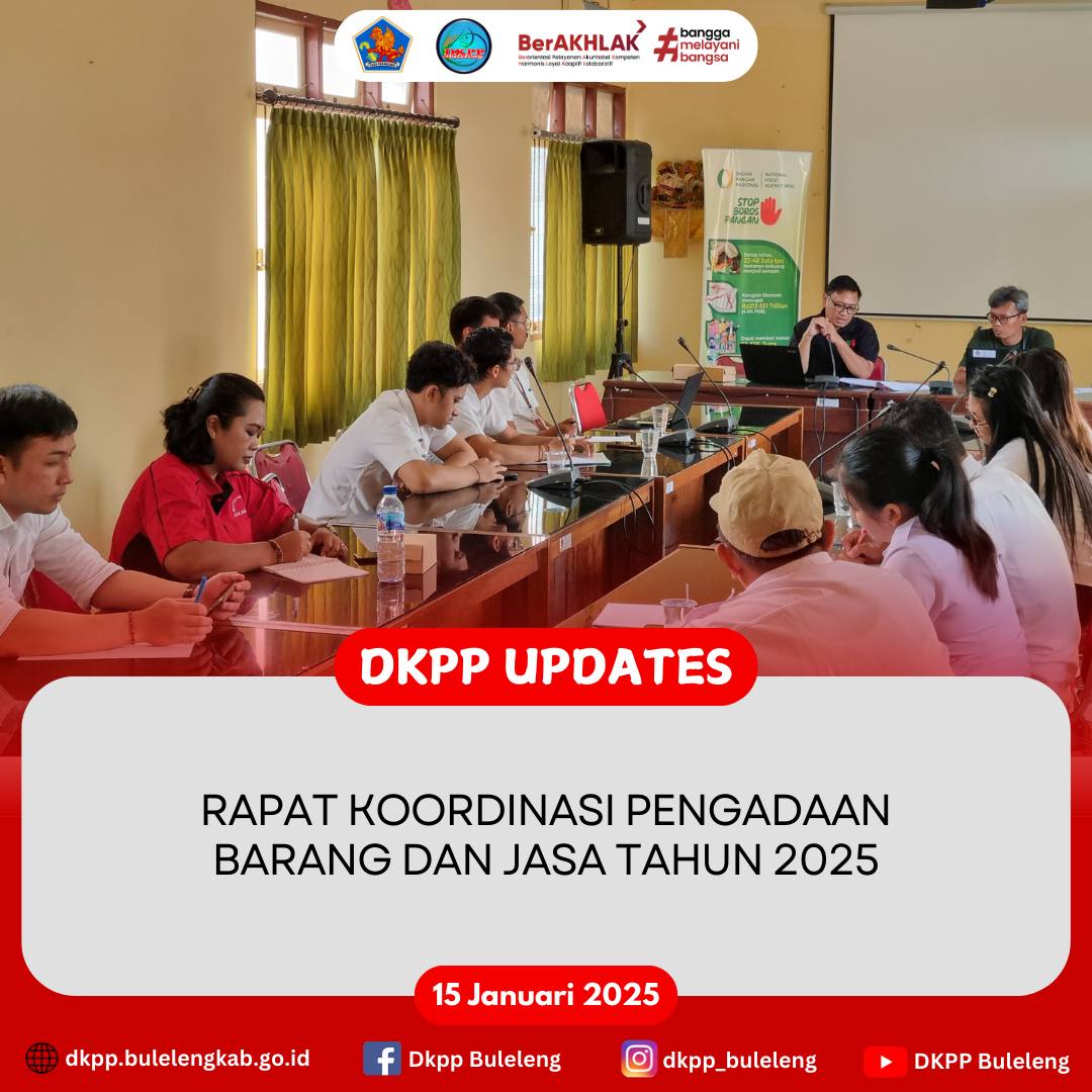 Rabu, 15 Januari 2025, Koordinasi Pengadaan Barang dan Jasa Tahun Anggaran 2025 bertempat di Ruang Rapat Dinas Ketahanan Pangan dan Perikanan (DKPP) Kabupaten Buleleng, yang dipimpin oleh Sekretaris Dinas Ariston Adhi Pamungkas, S.P., M. Env Man. bersama Fungsional Perencana, dan dihadiri operator yang membantu Pejabat Pembuat Komitmen (PPK). Rapat ini dalam rangka kelancaran pengadaan barang dan jasa DKPP Buleleng di tahun ini.