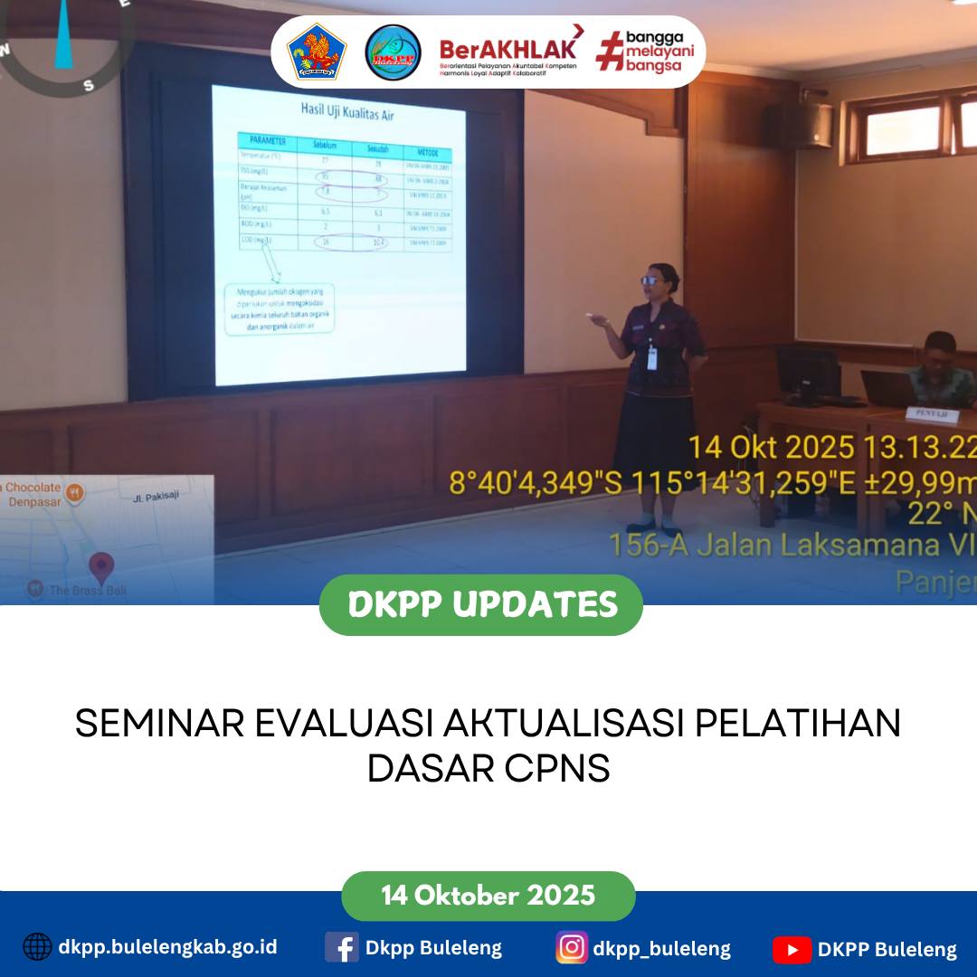 Selasa, 14 Oktober 2025 - Kepala Bidang Produksi Perikanan (Maria Cornelia Lero Bhara, S.Pi.) Dinas Ketahanan Pangan dan Perikanan (DKPP) Kabupaten Buleleng berkesempatan hadir sebagai mentor Peserta Pelatihan Dasar CPNS Golongan III Angkatan XI Tahun 2025 atas nama Ayu Made Sri Rastiti, S.Pi. dalam kegiatan Seminar Evaluasi Aktualisasi Pelatihan Dasar CPNS, bertempat di UPTD. PKSDM Badan Kepegawaian dan Pengembangan Sumber Daya Manusia Provinsi Bali.
