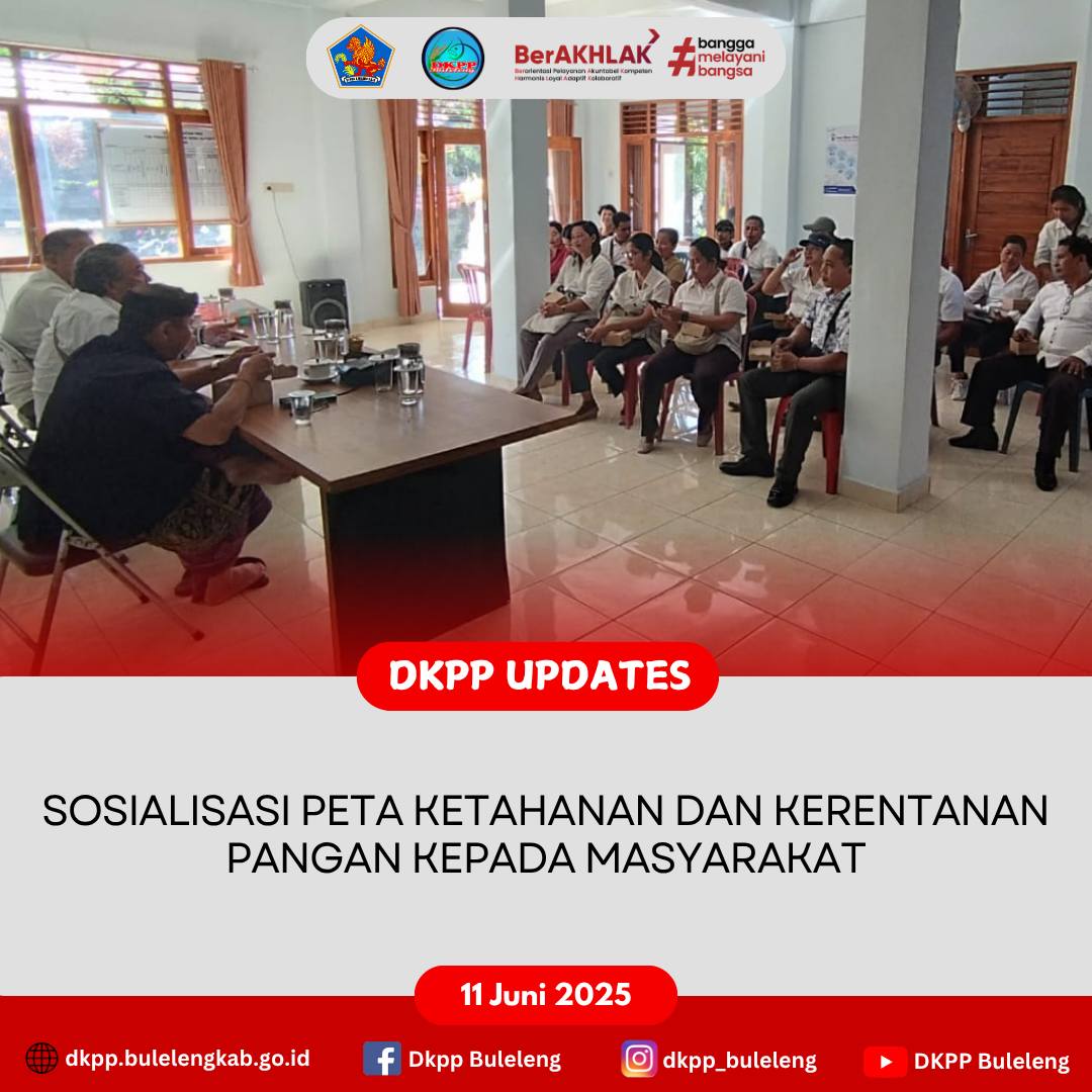 Rabu, 11 Juni 2025 - Dinas Ketahanan Pangan dan Perikanan (DKPP) Kabupaten Buleleng melalui Bidang Ketersediaan dan Kerawanan Pangan melaksanakan Sosialisasi Peta Ketahanan dan Kerentanan Pangan / Food Security and Vulnerability Atlas (FSVA) Tahun 2024 kepada para perangkat desa dan Kelompok Wanita Tani yang bertempat di Kantor Desa Alasangker, Kecamatan Buleleng.