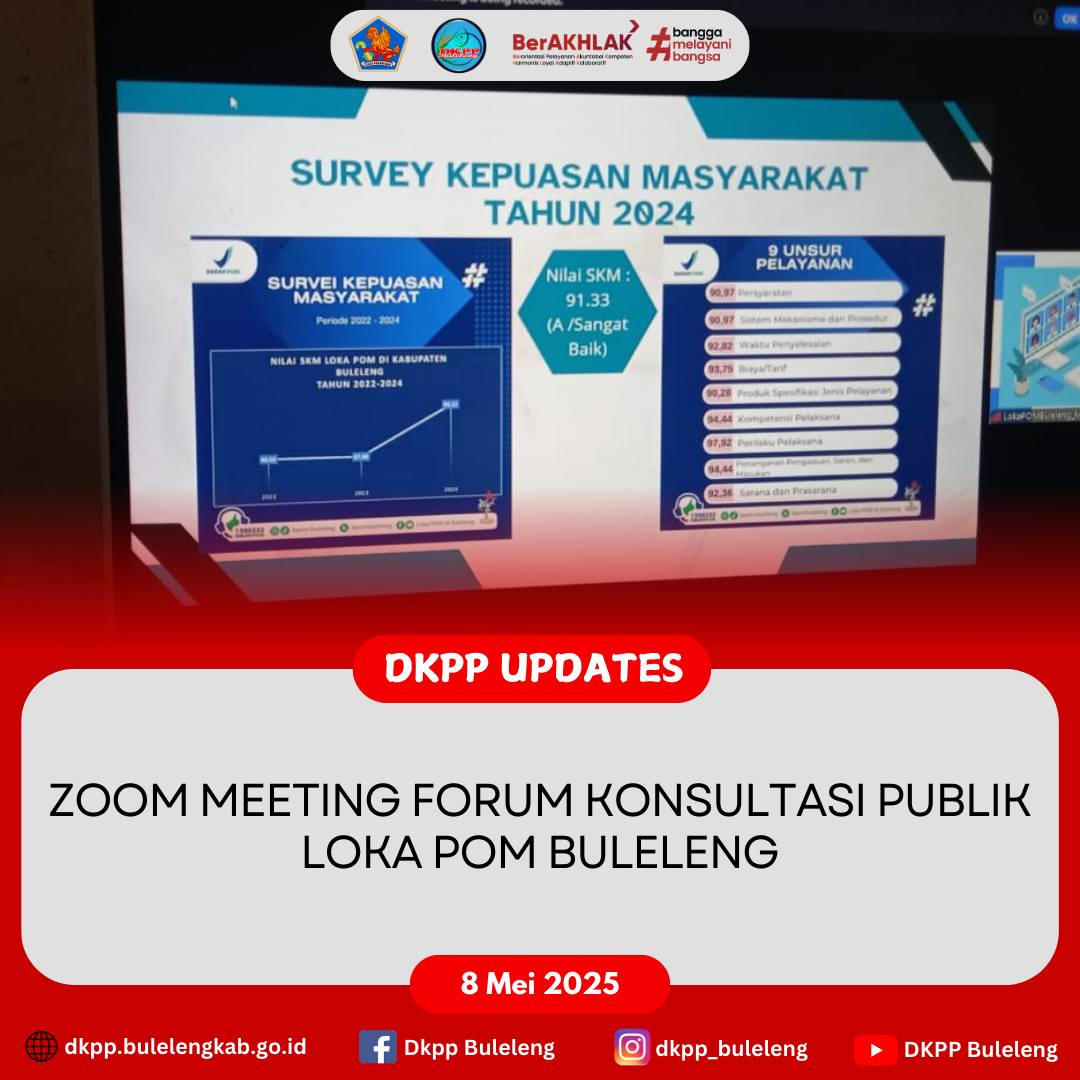 Jumat, 9 Mei 2025 - Dinas Ketahanan Pangan dan Perikanan (DKPP) Kabupaten Buleleng mengikuti Zoom Meeting Forum Konsultasi Publik diselenggarakan Loka POM Buleleng.