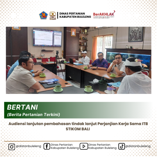 Kepala Dinas Pertanian Kabupaten Buleleng menerima audiensi lanjutan pembahasan tindak lanjut Perjanjian Kerja Sama ITB STIKOM BALI dengan Pemkab Buleleng khususnya Dinas Pertanian Kabupaten Buleleng terkait pendidikan, penelitian, dan pengabdian masyarakat.