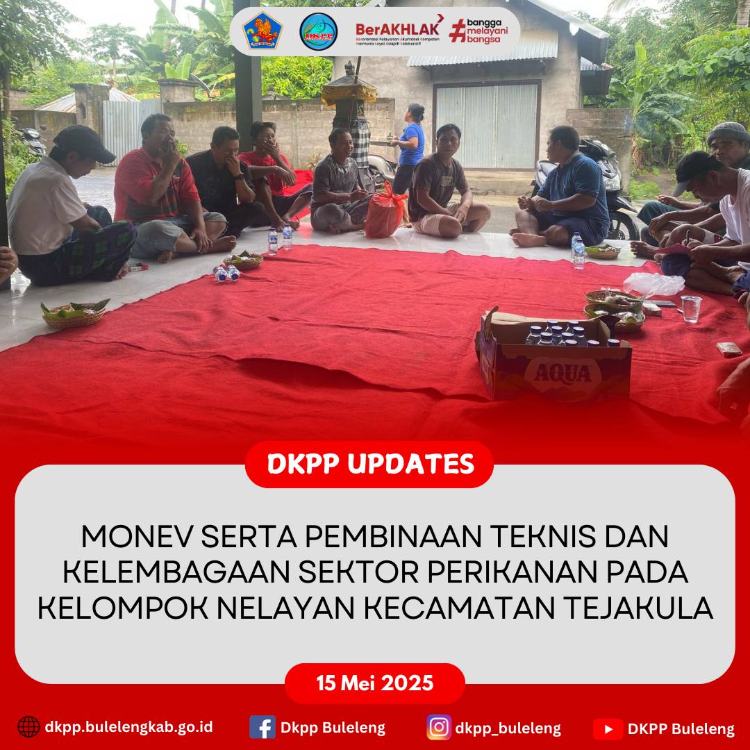 Kamis, 15 Mei 2025 - Dinas Ketahanan Pangan dan Perikanan (DKPP) Kabupaten Buleleng melaksanakan Monev serta Pembinaan Teknis dan Kelembagaan Sektor Perikanan pada Kelompok Nelayan / Kelompok Usaha Bersama (KUB) di Kecamatan Tejakula yaitu KUB Sari Segara dan KUB Segara Timbul. Kegiatan dihadiri