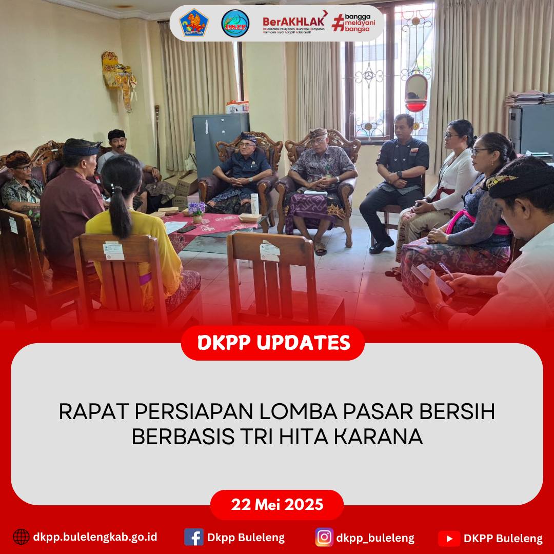 Kamis, 22 Mei 2025 - Dinas Ketahanan Pangan dan Perikanan (DKPP) Kabupaten Buleleng mengikuti Rapat Persiapan Lomba Pasar Bersih Berbasis Tri Hita Karana bertempat di Ruang Rapat DisdagperinkopUKM Buleleng. Rapat dipimpin Kepala Bidang Sarana dan Tertib Niaga Perdagangan dan didampingi Kepala UPTD Metrologi Legal, serta dihadiri oleh Kasubbag Umum dan Keuangan dan Analis Ketahanan Pangan DKPP Buleleng, dan para hadirin undangan.