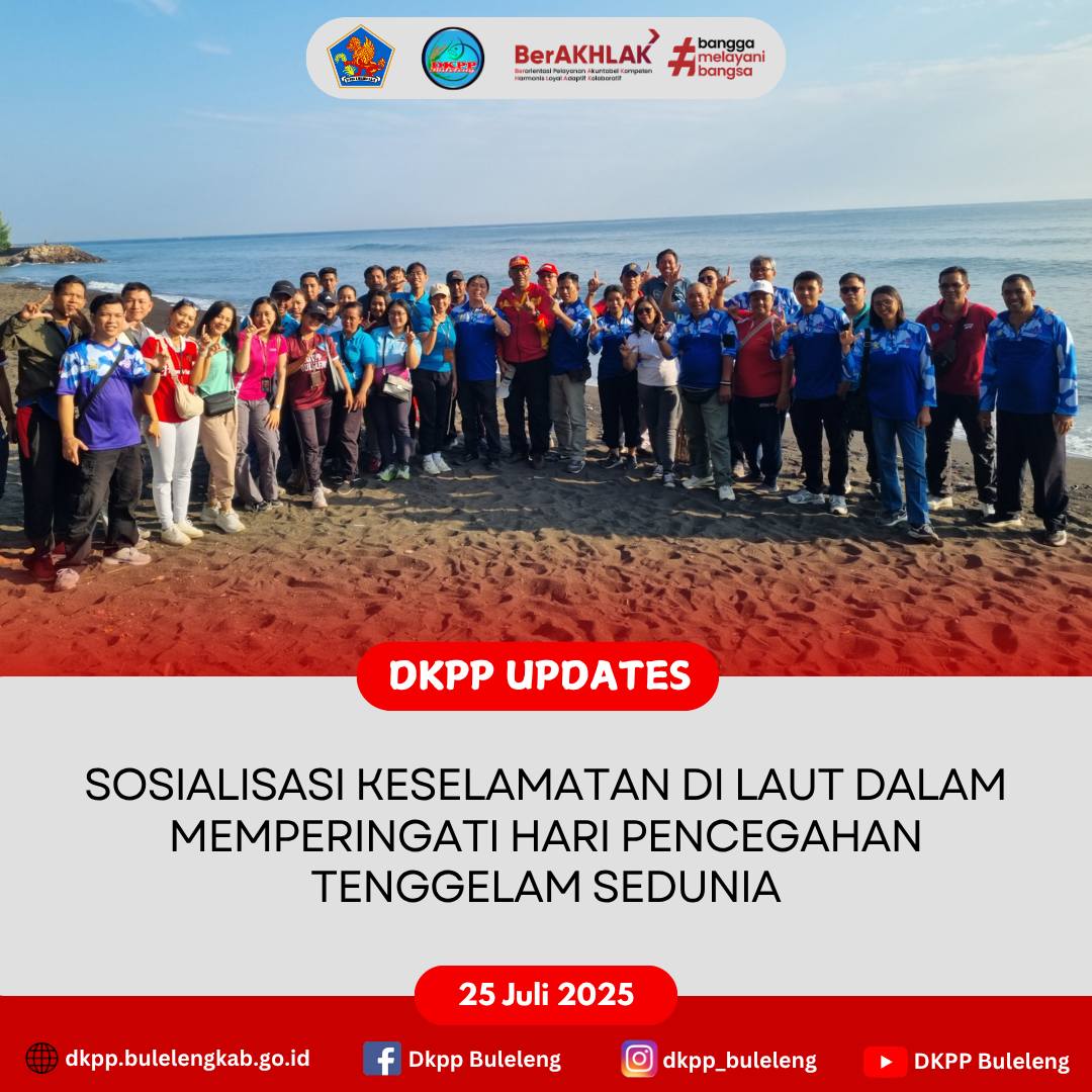 Jumat, 25 Juli 2025 - Dinas Ketahanan Pangan dan Perikanan (DKPP) Kabupaten Buleleng menerima Sosialisasi Keselamatan di Laut dalam rangka memperingati Hari Pencegahan Tenggelam Sedunia / World Drowning Prevention Day. Materi sosialisasi ini disampaikan oleh perwakilan Badan Penyelamat Wisata Tirta (Balawista) Buleleng. Kedepannya diharapkan masyarakat senantiasa menjaga keselamatan di kawasan wisata bahari dan perairan.