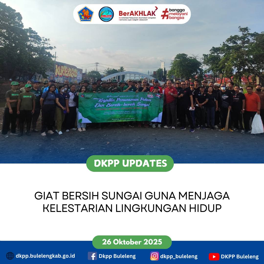 Minggu, 26 Oktober 2025 - Dinas Ketahanan Pangan dan Perikanan (DKPP) Kabupaten Buleleng mengikuti Giat Bersih Sungai berlokasi di Hilir Sungai Buleleng, Kelurahan Kampung Baru, sebagai upaya menindaklanjuti Surat Gubernur Bali perihal Gotong Royong Semesta Berencana Penanaman Pohon dan Bersih Sungai, serta sebagai wujud nyata komitmen Pemerintah Kabupaten Buleleng dalam menjaga kelestarian lingkungan hidup.